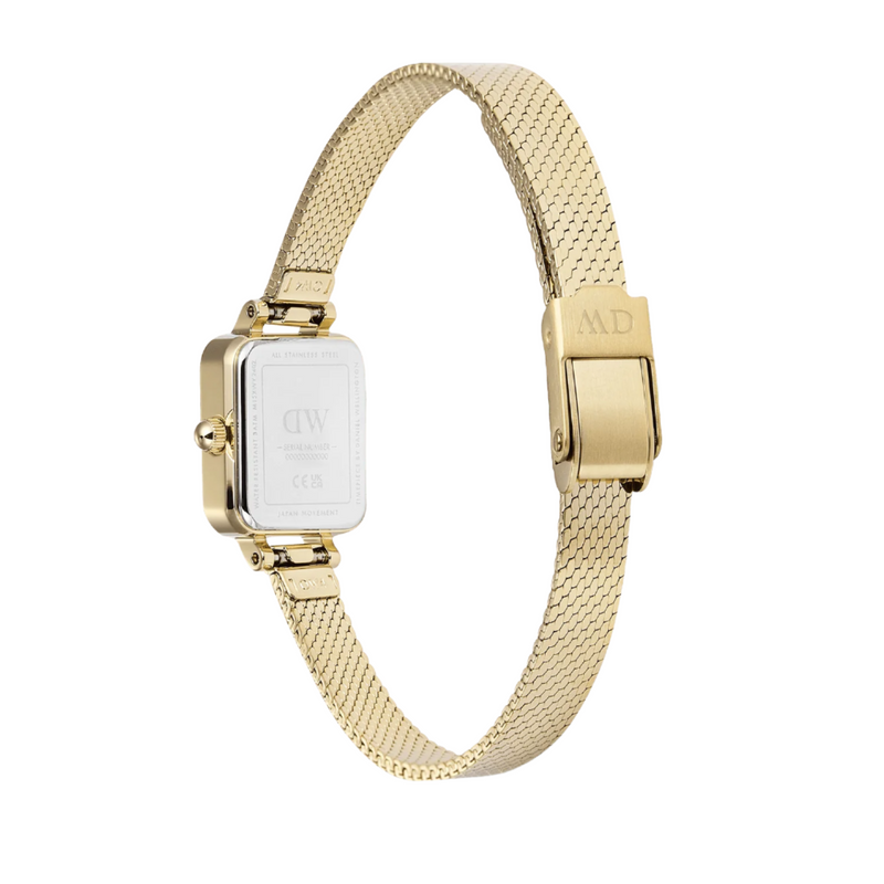 Designed for everyday wear, the Daniel Wellington Quadro Mini Mirror Reflection Gold Dial Watch DW00100801 offers reliable quartz movement, ensuring accurate timekeeping. The thoughtfully crafted case, measuring approximately 2 cm in width, sits elegantly on the wrist, highlighting its delicate yet durable construction. With a water resistance rating suited for daily use, this watch provides practicality without compromising its luxurious appeal.