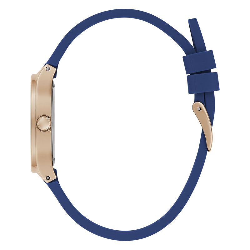 The Guess Eve Dress Pink Rose Gold Tone Watch GW0658L3 showcases a sleek 32mm rose gold-tone stainless steel case highlighting a minimalist white dial with a genuine diamond marker at 12 o’clock. Crafted for style and comfort, this women’s watch features a soft blue silicone strap that sits effortlessly on the wrist, secured with a classic strap buckle. Precision quartz movement ensures reliable timekeeping, while mineral crystal glass and 30 meter water resistance add durability, making it perfect for everyday elegance. A refined addition to any jewelry and watch collection, this piece elegantly captures Guess’s modern sophistication for women seeking a balanced blend of fashion and function.