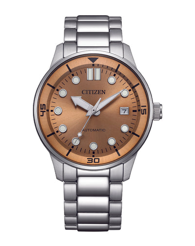 Crafted for refined everyday wear, the Citizen Automatic Silver Stainless Steel Bronze Dial Watch NJ0191-83X blends timeless design with modern precision. The 40mm stainless steel case and matching bracelet exude understated strength, while the rich bronze dial adds a distinctive warmth and bold contrast. This men's watch features an automatic movement with a 40-hour power reserve, eliminating the need for a battery through kinetic energy. Protected by a durable mineral crystal, the dial includes a discreet date window at 3 o’clock and luminous hands for enhanced readability. With water resistance up to 50 meters and a secure push-button clasp, this stainless steel watch delivers both elegance and reliability. A sophisticated balance of heritage and innovation, it’s a versatile choice for any occasion.