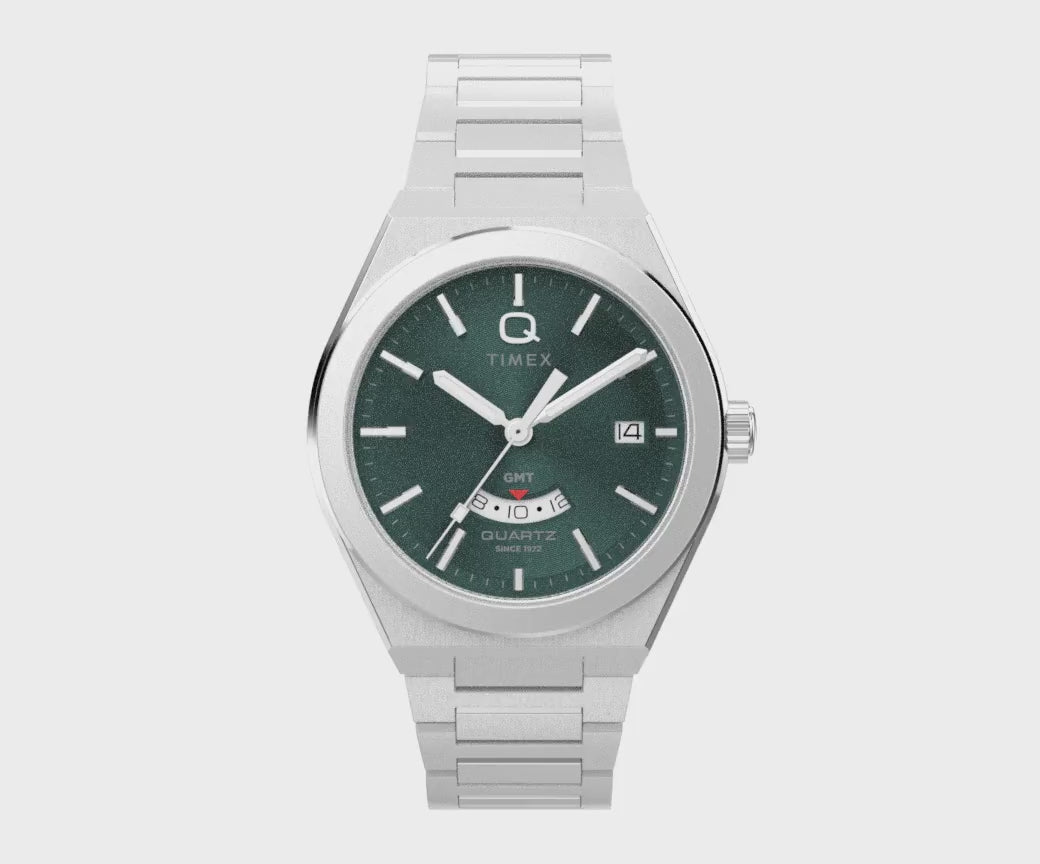 Channeling the bold designs and decadent glamour that filled the scene in ‘70s West Hollywood, the Q Timex® Continental GMT brings refinement to our beloved Q Timex collection with a streamlined 39mm silver-tone case with polished edges and a sleek GMT window at 6 o’clock. We’ve updated it with a verdant green dial with a radial texture and a clean presentation that’s effortlessly cool, highlighted by faceted hour markers, luminant hands for enhanced visibility in the dark, and a glanceable date window beside the 3rd hour marker. Completing the truly ‘70s style look is a tapered and integrated brushed stainless-steel bracelet.